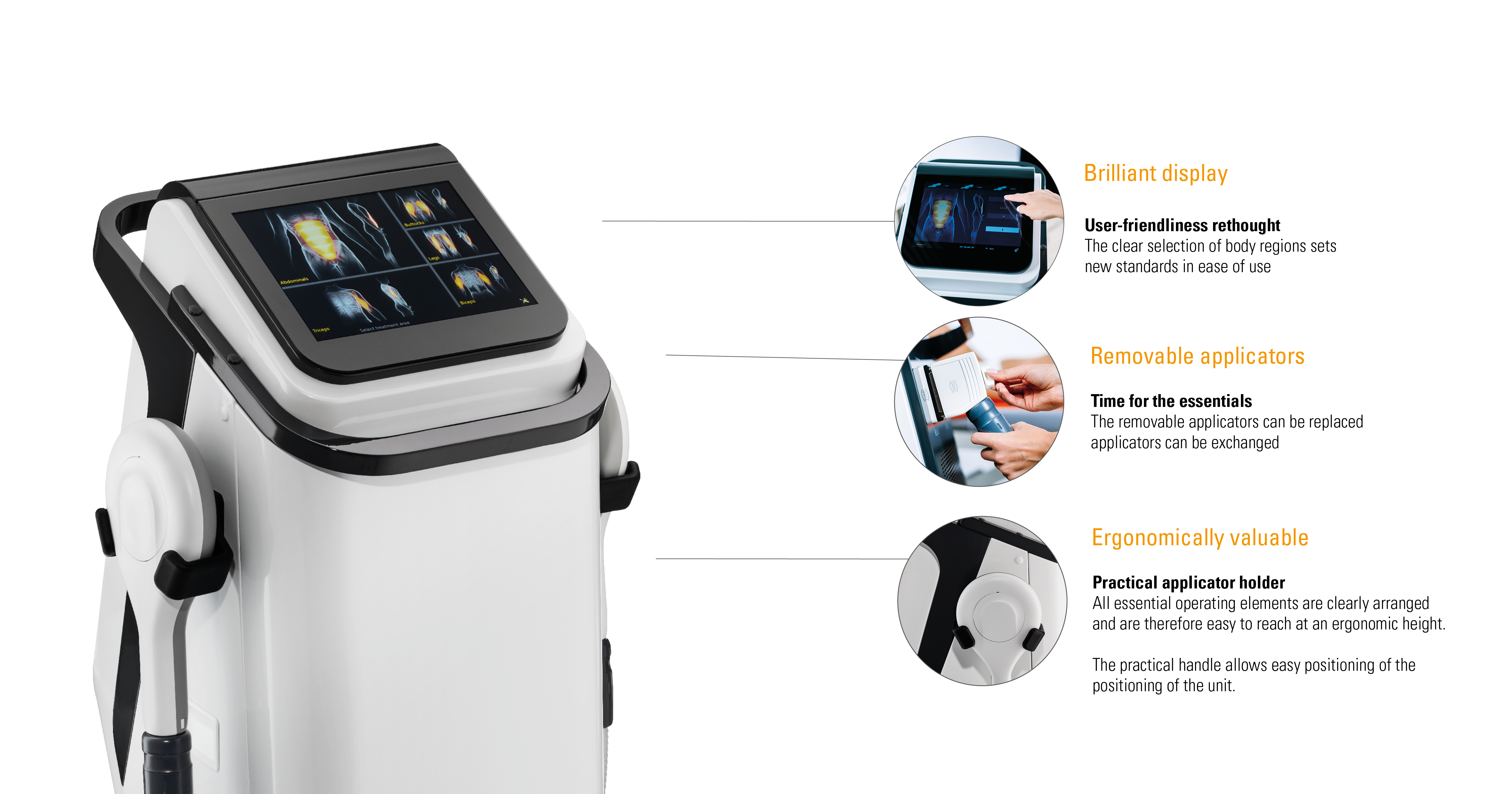 Z Tone are două aplicatoare de aceeași dimensiune. Ambele aplicatoare sunt utilizate în același timp, cu parametri de aplicare identici sau separat unul de celălalt. Toți parametrii relevanți ai tratamentului pot fi setați, salvați și ajustați cu doar câteva clicuri. Z Tone permite tratamentul cu două intensități diferite în același timp. De exemplu, bicepsul stâng și drept pot fi tratați cu intensități diferite fără nicio problemă.